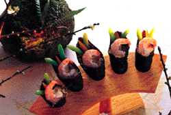 【材 料】壽司皮3張、梅味沙拉200克、蘆筍、苜蓿芽、明蝦 【做 法】 1.壽司皮用火微烤。 2.壽司皮以角對角對齊捲成甜桶狀,內置苜蓿芽、蘆筍。 3.在餡上放入梅沙拉醬擺上明蝦後,插於手捲架即可食用。