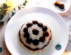 【材 料】Q梅10粒、圓糯米300克、芋頭泥或紅豆沙半碗、冰糖1大匙、蔬菜油1又1/2匙、水1/2杯 【調味料】糖2匙(平匙)、鹽1/2小匙、日本太白粉、水1大匙 【做 法】 1.圓糯米用水浸泡3小時,撈出瀝乾水份,加1大匙蔬菜油拌勻,入蒸具(蒸具中鋪紗布墊底) 蒸50分鐘取出,加鹽、冰糖拌勻 2.模型摸油,將10粒的Q梅排好,再放入一半的糯米飯,芋頭沙用手壓成扁圓形,放在中間,最後把剩下的米糕裝滿模型,用中火蒸15分鐘後,扣在圓盤,將調味料煮好淋上即可。
